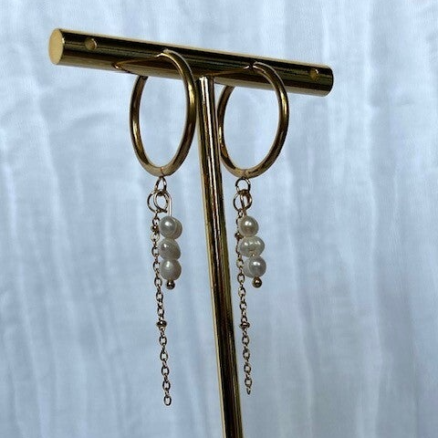 Laat je sierlijkheid spreken met deze verfijnde oorbellen, waarin zachte parels en een gouden ketting samenkomen.